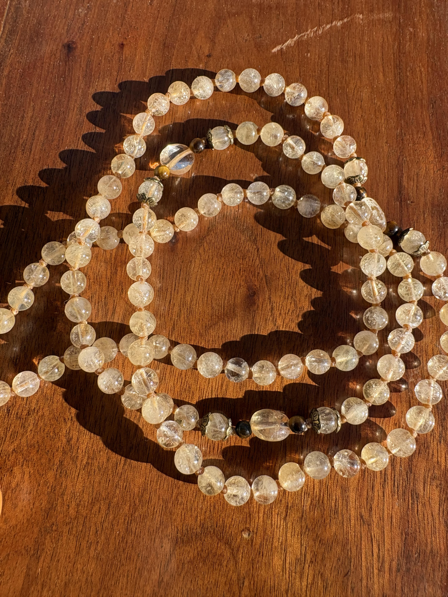This is a Tibetan-style mala with 108 beads, plus three sections of marker beads between each set of 27 beads.
